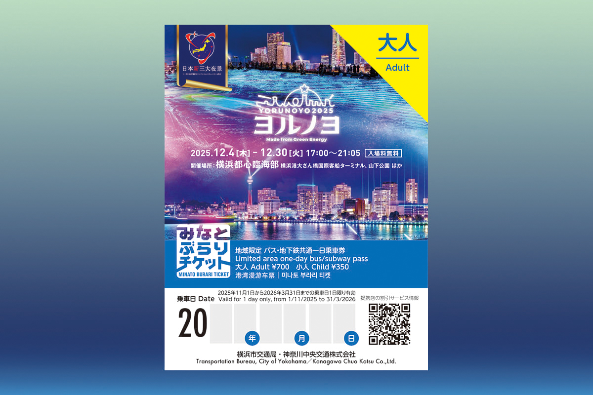 요코하마시 교통국이 판매하고 있는 1일 승차권 「미나토부라리 티켓」과, 일본 최대급의 일루미네이션 이벤트 「밤에 나타나는 빛의 요코하마〈요르노요 2025〉」가 타이업한 특별 디자인을 판매합니다.